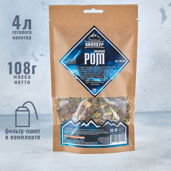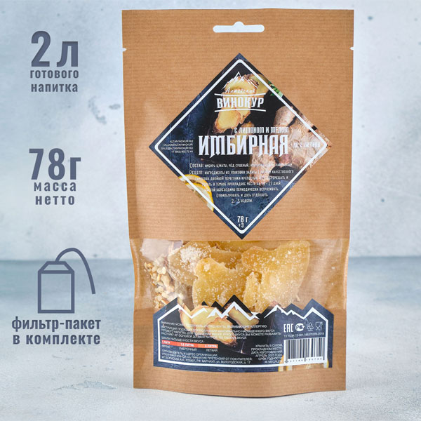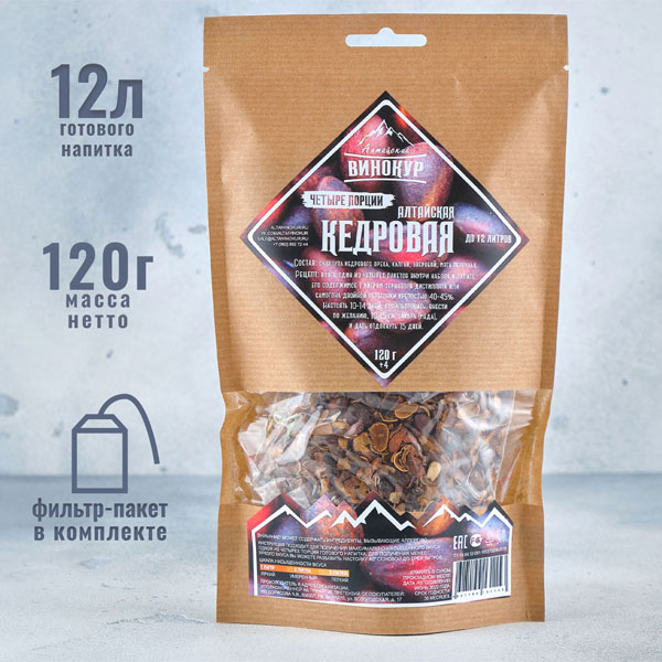 Состав: лимон кружочки, шишка кедровая, черный чай, шиповник, солодка, элеутерококк, можжевеловые веточки, ягоды можжевельника, сахарный колер.