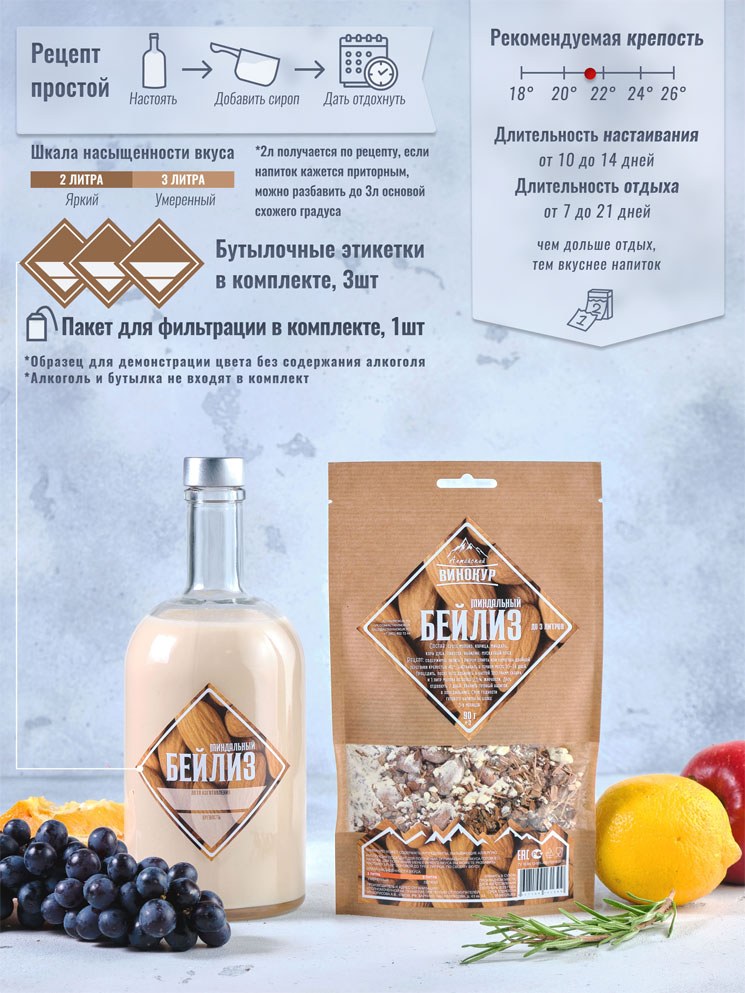 Миндальный бейлиз — это изысканная настойка, вдохновленная классическим ирландским ликером Baileys. Настойка обладает богатым, кремовым вкусом, в котором сочетаются деликатные нотки миндаля, корицы и ванили. Эта настойка имеет гладкую текстуру и богатую консистенцию, идеально подходящую для употребления в чистом виде либо в комбинации с коктейлями и десертами.