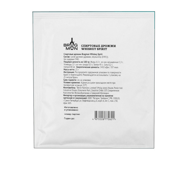 Внимание! Дрожии Bragman Whisky Spirit предназначены только для сбраживания предварительно осахаренного сусла, полученного из солода. Без добавления сахара!