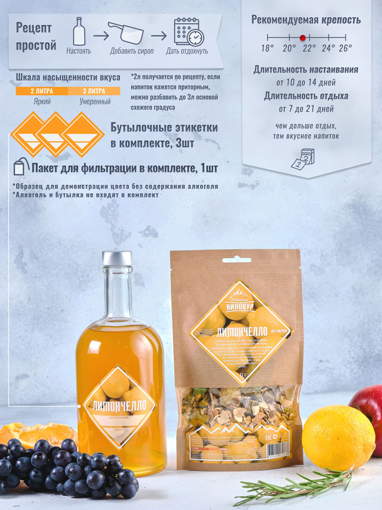 Освежающий летний, легкий ликер для ценителей ярких цитрусовых напитков. ~20% об. Лимончелло — это ликер, который завоевал популярность благодаря своему освежающему и яркому вкусу. Это фирменный рецепт от «Алтайского Винокура» вдохновленный национальным итальянским напитком. Изготавливается на основе цедры лимона, а также цедры апельсина, цукатов ревня, листьев лайма, куркумы, орегано, тимьяна, розмарина и полыни. Цитрусовые ноты лимона и апельсина придают лимончелло свежий и ароматный вкус. Цедра лимона добавляет немного горчинки и глубины вкусу. Цукаты ревня придают напитку необходимую кислинку и легкую фруктовую ноту. Листья лайма добавляют свежести и освежающего аромата. Лимончелло — это идеальный напиток для наслаждения в летнюю жару. Он может быть подан как самостоятельный дижестив или использован в коктейлях, добавляя им освежающий и яркий акцент. Свежие цитрусовые нотки и ароматы трав делают эту настойку незабываемой и уникальной.