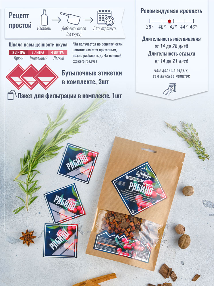 Состав: сушеная рябина, дубовая щепа, изюм, финик, корица.