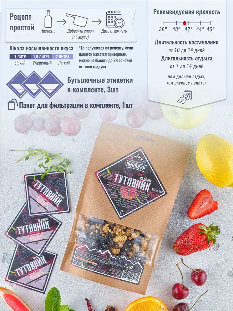 Наш набор «Тутовник на джине» дает в меру сладкий, слегка терпкий, с пряным вкусом и насыщенной ароматикой напиток. Основной (и главный в вопросе вкуса) ингредиент — можжевельник — важный компонент в производстве любого джина, именно он даёт напитку характерный «хвойный» вкус.