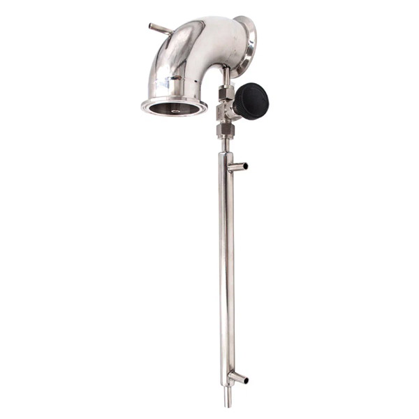 Универсальный узел отбора по жидкости и пару — это решение с простой настройкой и удобным управлением для получения чистого и крепкого продукта до 96,6 градусов. Узел отбора на 2 дюйма используется в процессе самогоноварения для отбора части продукта по жидкости либо по пару. Отбор по паруПри отборе по пару часть поднимающихся вверх паров отбирается через шаровый кран. Остальные пары поднимаются в холодильник, конденсируются в флегму и возвращаются через трубку перелива в царгу для дальнейшего участия в процессе тепломассообмена, в ходе которого продукт очищается и укрепляется. По пару удобно отбирать тело за счет большой скорости. Отбор по жидкостиПри отборе по жидкости используется конструкция стаканного типа. Горячие пары поднимаются в холодильник, конденсируются и в виде флегмы стекают в стакан отбора. Ее часть отбирается через игольчатый кран, а остальная флегма возвращается в царгу через трубку перелива для участия в тепломассообмене. По жидкости удобно отбирать головы за счет тонкой регулировки игольчатым краном. Как работает универсальный Узел отбораДля работы установите узел отбора на царгу или на диоптр, сверху холодильник, а далее – съемную крышку с носиком и гильзой. В случае, если высота не позволяет разместить холодильник вертикально, подсоедините холодильник через отводы. В этом случае его КПД увеличится на 10% и вся стекающая флегма будет протекать через стакан в узел отбора по жидкости. Для получения максимального крепкого и чистого продукта выполняйте отбор по жидкости. Скорость отбора регулируйте при помощи игольчатого крана. Чтобы получать продукт с большей скоростью, используйте узел отбора по пару. В этом случае крепость будет немного меньше, но сохраняется стабильное качество продукта. Для регулировки крепости и скорости используйте шаровой кран. Преимущество отбора по пару перед отбором по жидкости – весь продукт отобрать невозможно, его часть обязательно будет стекать в царгу. По жидкости удобно отбирать головы (удобная регулировка игольчатым краном), а по пару – тело (большая скорость отбора, стабильное качество продукта). Новый универсальный узел отбора на 2 дюйма – отличное дополнение к классическим кламповым аппаратам с дефлегматором. Он решает большую часть проблем с дробным отбором, фактически заменяет дефлегматор. При его использовании нет необходимости регулировать процесс мощностью и потоком воды. Преимущества узла отбора